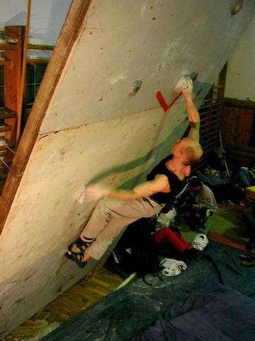Tak proběhl krátký rozhovor ve společné izolaci (ano to se dá pořadatelům vytknout)během závodu. Topinkoval jsem i ve třetím a odpočíval na čtvrtej. De se na věc: Skokem přes strop do madla, z něj nahoru do rajbásku na zónu, nášlap křup, rup, jau, a top se nekonal. Vazy v koleni si řekli, že se přeuspořádaj a já si myslel že se poseru. Druhej pokus, překonat bolest, topinka a druhej den sem byl jen divák.