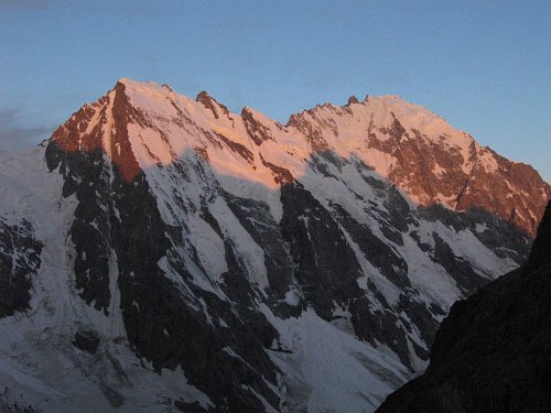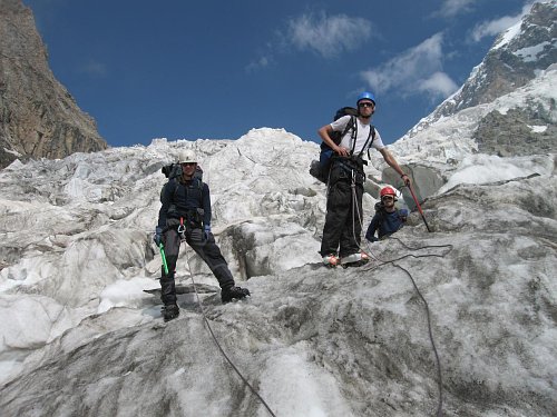 Bořím se tak akorát, trošku mě znervózňují trhlinky, které na slunci nově vyjely. No nic moc. Konečně se vyhýbám poslední. Jenže najednou stojím na mokrém ledu. Všechen firn odtál a teď tu je jen led a crčí po něm voda. Paráda . Svah má cca 60 stupňů a končí kdesi skoro kilometr pod námi. Jediná možnost, kde by se člověk zastavil, je obrovská trhlina. Tři pevné body, opakuji si. Noha, noha, ruka, ruka a takhle asi milionkrát. Traverz je sice konečný, ale dlouhý, tuze dlouhý. Visíme na hrotech cepínů opřeni o kolena. Je to jediná možnost, jak dát chvíli odpočinout lýtkům. Naše pohledy se neustále upírají na suťový pás nalevo od nás. Kolik ještě? Zírám po každé sérii a hypnotizuji ten hřebínek.