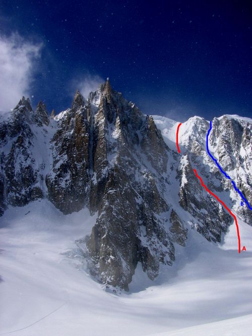 A - Gervasutiho kuloar z Mt. Blanc du Tacul, 600 m 50/55º, na lyžích S. Saudan 1968, B – Kuloar Jager 600 m do 60º, na lyžích J.Bessat 1977, na snowboardu E.Bellin, P.Besse,Ch. Cretin a B. Gouvy 1990