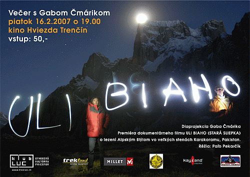 Budete zde moci zhlédnout unikátní diashow Gaba Čmárika a premiéru dokumentárního filmu ULI BIAHO  (Stará slepice) a o lezení alpským stylem ve velkých stěnách Karakoramu v Pákistánu.
