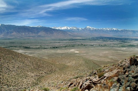 Pohled na Bishop z hřebenů pouštních hor White Mountains. Nad Bishopem (ta zelená oáza) se zvedá Sierra Nevada. Ještě v půlce července se po ní válí množství sněhu.