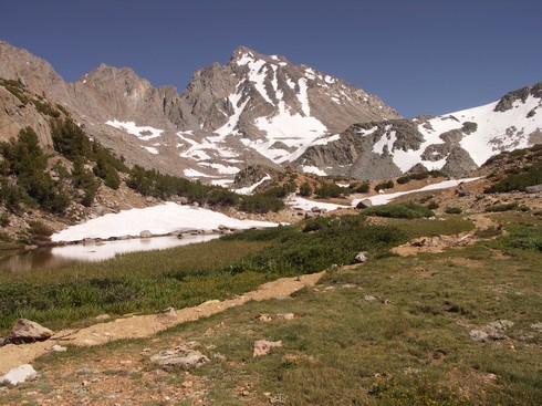 Sedlo Bishop Pass se blíží, nad jeho zasněženou plání se zvedá Mount Agassiz (4235 mnm).