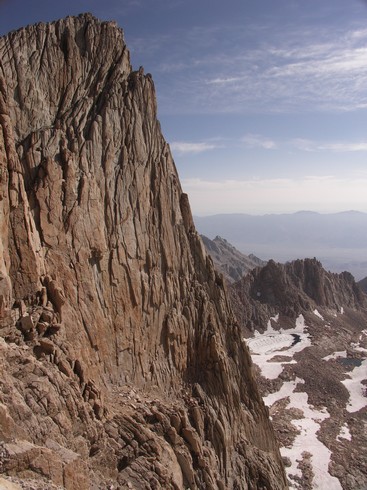 Část východní stěny Mount Whitney, dole v údolí jezero Iceberg Lake, v dálce White Mountains a Owens Valley.