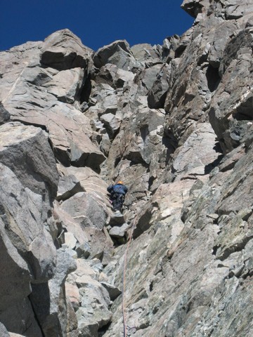Yannick v cestě U-Notch na North Palisade (4340 mnm), var. Chimney 5.4
