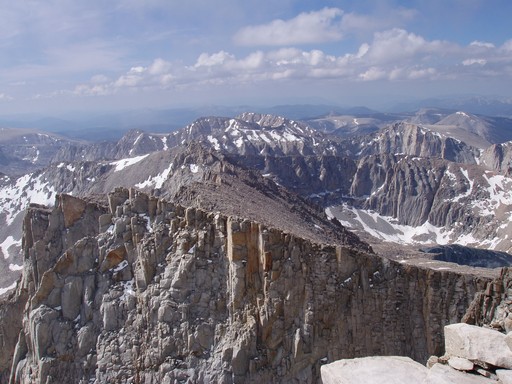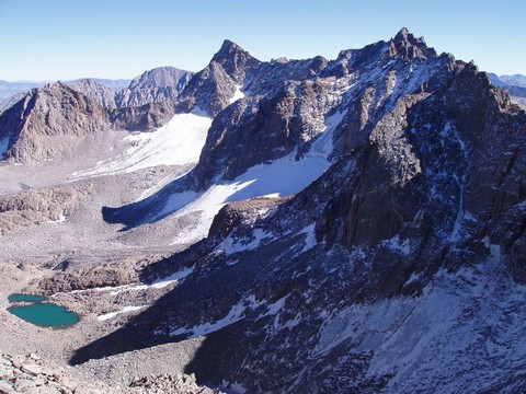 Palisades z vrcholu Mount Agassiz. Zhruba uprostřed nahoře vidíte dvě pyramidy, nejoblíbenější zdejší lezecké cíle – nižší Temple Crag, vyšší Mount Sill.