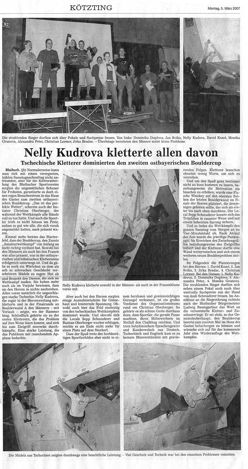 Závody byly parádní, díky za ně. Harmonogram byl snad na vteřinu dodržen, zkrátka ta námi vysmívaná německá (pře)pečlivost má i své pozitivní stránky. Jen ty ženský bouldry byly dost fádní, snad se němečtí stavitelé pro příště poučí. Díky své rozdvojené osobnosti a Azbestovi jsem mohla okoštovat i chlapské bouldry, za což jsem velmi vděčná, neb byly velmi vydařené. Stejně tak ceny a což teprv Sieger-hotový rodinný poklad. A ten titulek v plátku lázeňského města Keuzting, to si opravdu nezasloužím. A Josému přeju, ať se jeho koleno co nejdříve umoudří. Tak noch einmal dankeschön a nächstes Jahr aufwiedersehen tamtéž.