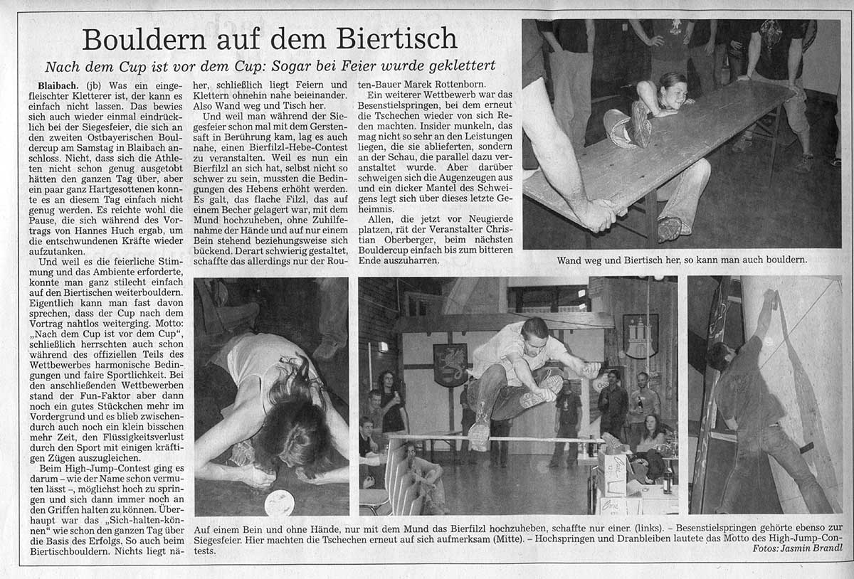 Bohužel pro něj se však jednalo o závody s mezinárodní účastí a místní rozhodně nebyli v početní převaze. Tohoto přátelského, přísně lokálního setkání lezců ze Šumavského příhraničního regionu (Blaibach, Rosenheim, Regensburg, Plzeň, Budějovice, Praha, Ústí, Brno....) se zúčastnilo 8 lezkyň a 40 lezců. Závody byly připraveny s typicky německou dokonalostí. Speciálně jen pro tuto příležitost vyrostla v místní tělocvičně zdejších sokolů stěnka skládající se z 5-ti profilů, za než by se rozhodně nemusel stydět ani Český pohár. Na nich pak vyčaroval pan Azbest s pomocí místních borců 5+5 excelentních problémů für damen und herren, na kterých se ti nejlepší kvalifikovali do stejného počtu bouldrů finálových.
