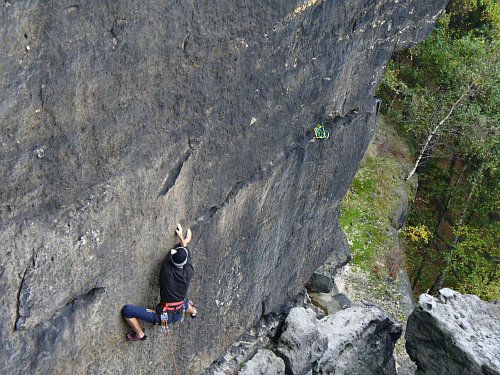 V podstatě jsem měl pro první saský výlet splněno. Přesto jsme se s Prckem pustili, spíše z nouze do dobývání naprosto šílené Zwang und Freiheit IXb. Už dolézt k prvnímu kruhu byla pěkná dřina, ale překrok, spíše přeskok, kolem něj doprava a dolez ke druhému už přímo ohrožoval celistvost našich prstů. Zelenina nad druhým byla již jen rozpustilým zakončením. Humus. Protože se mě často zmocňuje zvrácené potěšení z té hrůzy, stejně mi to nedalo a ještě jednou jsem do něj nalezl pro RP. Na vylepšení dojmu a k příjemnému zakončení padla ještě dvouhvězdičková tříkruhovka Blitzplatz RP IXb.