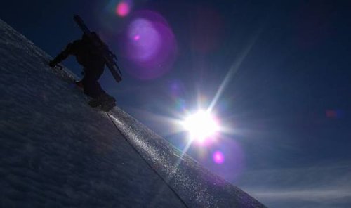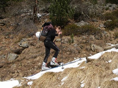 Sjezd sněhovými poli je opatrný, ale rychlý. Na chatě chytáme ještě poslední paprsky sluníčka a hledíme do severních stěn Zebru a Ortleru, které, zdá se, mají dosti zmrzlé podmínky. Čeká nás ještě jedna zmrzlá noc bohužel už bez slivovice, ale s dostatkem vody filtrované prkennou verandou, která ji chytá do okapu. Druhý den je jasné, že sestup bude částečně po svých -- sníh po 4 dnech ze stop údolní stezky skoro zmizel.