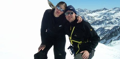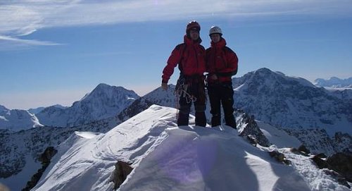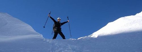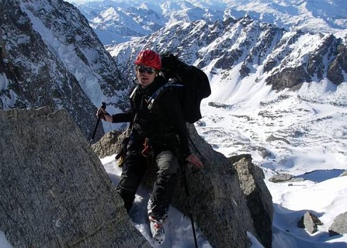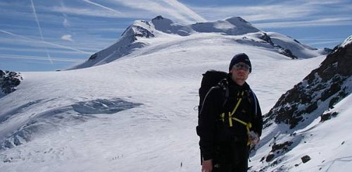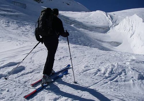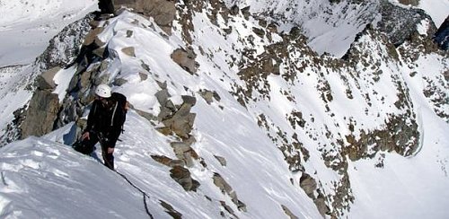 Skialpy na zádech cítíme v posledních 200 metrech, počasí nám tento pocit rozpouští, ale pouze na chvilku. Z vrcholu sestupujeme pod skalním hřebenem do sedla se zmíněným prašanovým žlabem. Monča je nesvá, proto jistíme až do půli žlabu, odkud sjíždíme úplně hotoví ledovcem k moréně a jen chvilku si vychutnáváme prašanu, pak opět hledání optimální stopy mezi kameny. Po 11 hodinách jsme na chatě. Po ohledání své manželky rozhoduji příští den pasovat na restday. Další plán se nám upravil po nakouknutí na ledovcový chvost na Cima Vertana (3545m, http://www.seilschaft.it/vertainspitze.htm) , který hodnotíme za současných podmínek ledově o ničem a hodláme pokořit severozápadní hřeben, kde prý vede jakási ferata. Další den vstáváme v 5 ráno, vylézáme kromě posledních 200 m s mačkami a piklem pomocí lyží do sedla Angelusscharte (3200 m), lyže zajišťujeme pod sedlem, protože hřeben je hřebenitý.