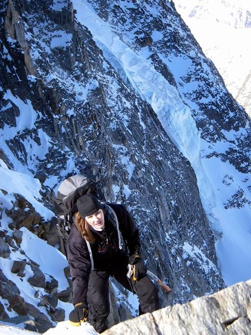 Prvním cílem je severní stěna Hoher Angelus ( 3521 m, http://www.seilschaft.it/angelus.htm), kterou kluci vymlaskli v listopadové akci s promrzlými končetinami. Kluci na chatě nám poradili, že zásadně s lyžemi na zádech a sjezdem žlabem v levé části stěny. V 7 hodin vyrážíme na skialpech k nástupu, hledáme optimální stopu ve zbytcích sněhu mezi kameny. Cesta k nástupu se nám protahuje skoro na 4 hodiny, na ledovcovém výšvihu se kšírujeme, nástupovou délku lezeme sólo až ke štandu na malém výběžku. Led je štípavý, přemrzlý, výlezovou variantu volím rychlejší asi 15m ve strmějším ledu, která končí v ledovo-firnovém poli vedoucím k vrcholovému kříži.