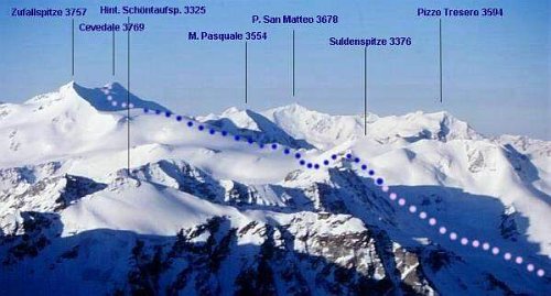 Po nakouknutí na začátek hřebenu rozhoduji k sestupu na ledovec Laaserferner odkud se snad na hřeben dostaneme po sněhovém poli. Po úmorném výstupu a kličkování se dostáváme na hřeben, kde evidentně cesta nezačíná, navazujeme se a dolézáme po viklajících se telefonních budkách k začátku Martelweg na vrchol, cesta vede lehce pod hřebenem a pro mne jako vedoucího je utrpením každou chvilku zahučet popás do bílého humusu. Dáváme si termín do 14.00 na vrcholu, jinak balíme. Vrcholový kříž nás magnetizuje, dolézáme už opravdu po firnovo-skalním hřebeni na vrchol a shlédnutí obrovské prašanové pláně nad ledem ze severu jsme rádi, že jsme zvolili tuto variantu. Monča už ani nemluví, přemlouvám ji k tyčince, kterou nevnímá přes odpor k sestupu po stejné trase. Nakonec vymyslí sestup asi 300 m žlabem na ledovec,na kterém ji poctivě jistím se strachem, že to s náma celé spadne. Závěrečných 20 m na ledovec je dvojkové lezení. Na ledovci ztrácím chuť do života s několikakilovými bambulemi po pár krocích, Monča je v sedle jako první.