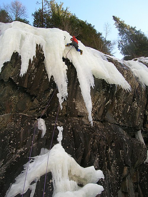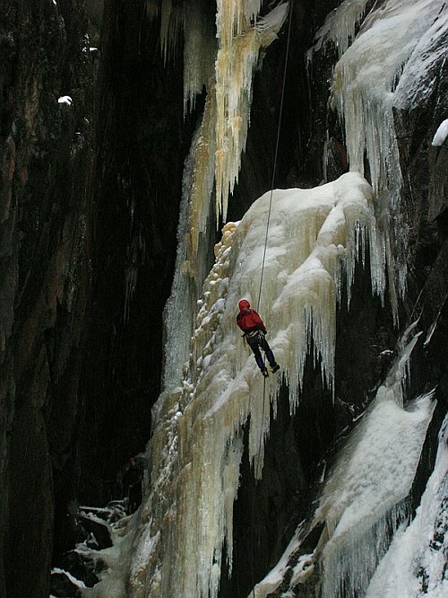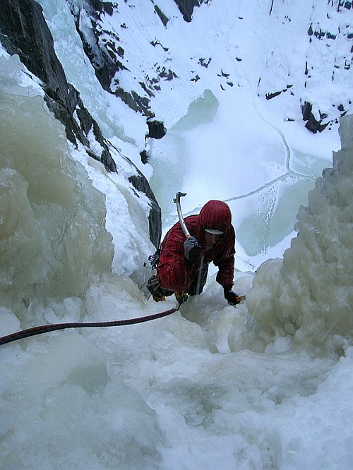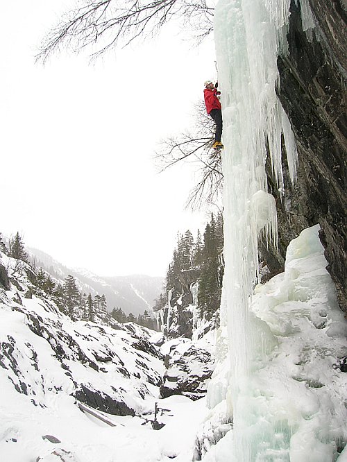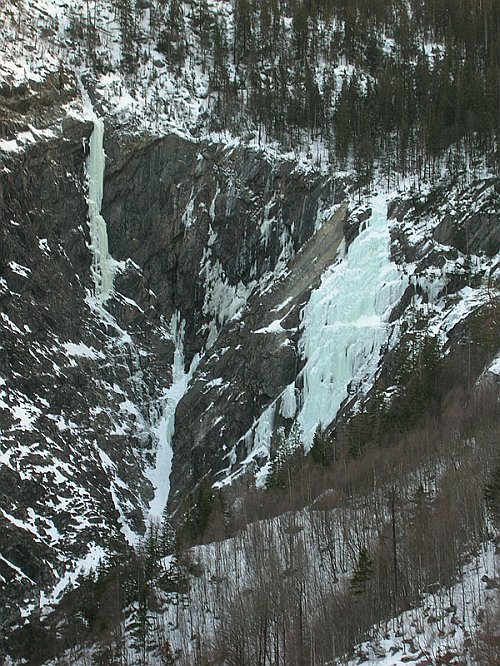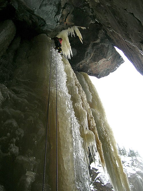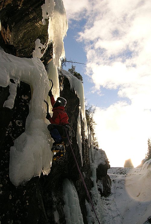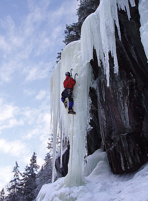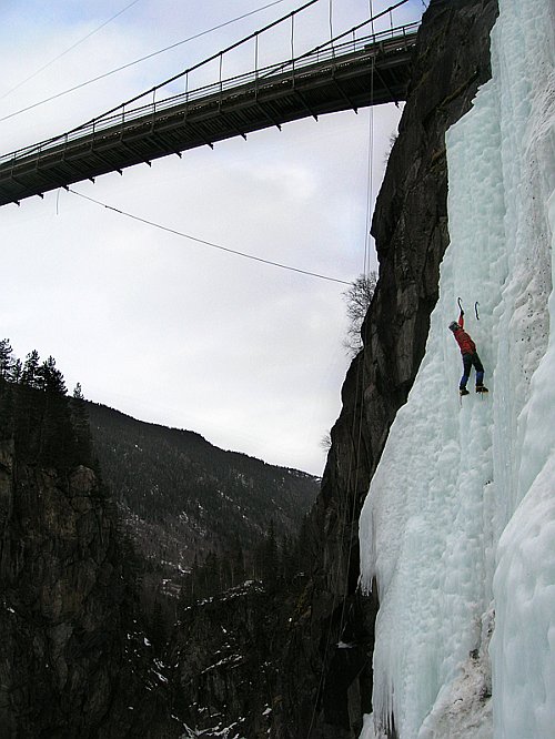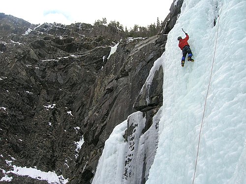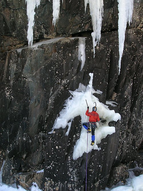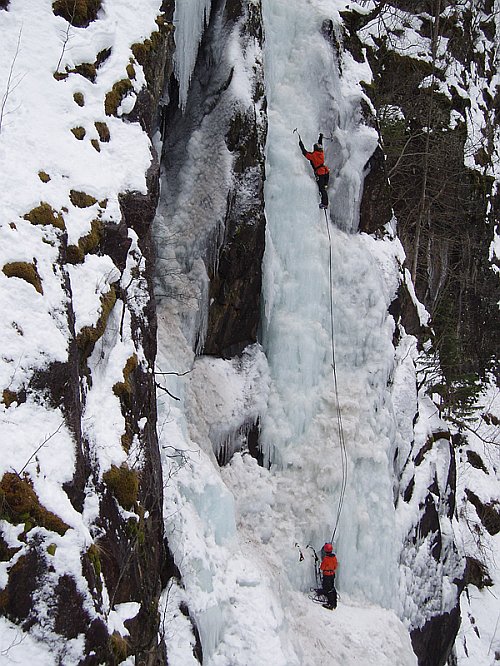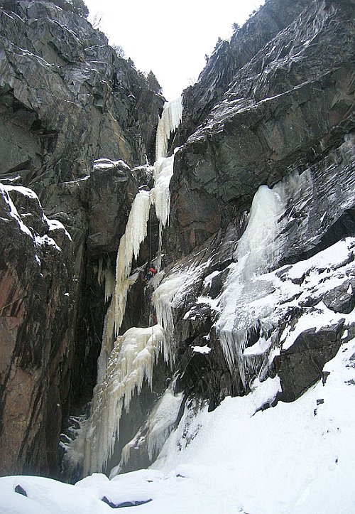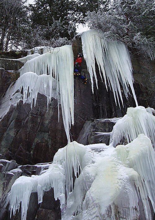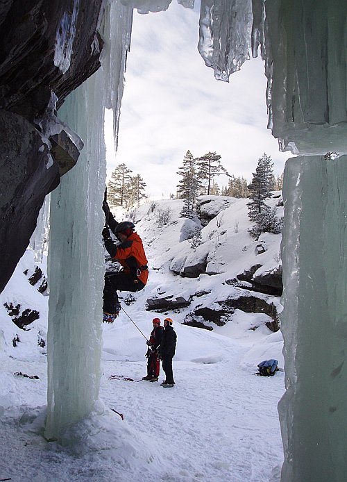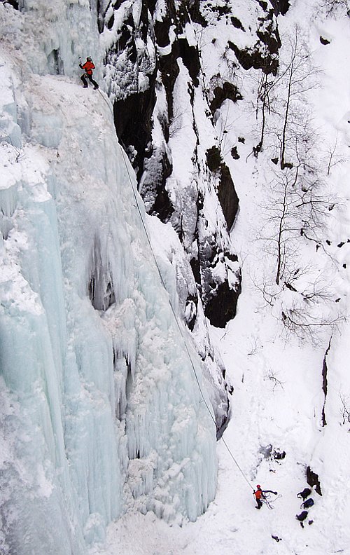 Tři týdny utekly jako voda a my přistáváme v Norsku, vše funguje perfektně, Radek už nás očekává. Nakládáme se a vyrážíme, veselou náladu nám kazí jen teploměr. Pořád se drží na čtyřech stupních plus, a to už je skoro půlnoc. Prý teplo už je pár dní. No však to tak rychle neroztaje, přesvědčujeme se navzájem. Ubytování Radek zamluvil nádherně, chatičku pro pět u jezera Tinn. Nádherné ráno se kazí, když míjíme ceduli Rjukan, začíná pršet. Naštěstí dřív než zaparkujeme u ledu, déšť ustává. Pohled na rampouchy nám hned zlepšuje náladu. Plán je jasný, Radek s děvčaty zůstane u Vemork bridge, Banán a já vyrazíme kaňonem vzhůru doufajíce, že nás pustí některá místní chlouba, Juvsoyla nebo ještě lépe Lipton, honosící se v průvodci magickým číslem 7.