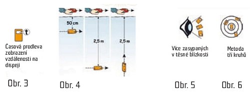 Přesné dohledání zasypaného [lokalizace, zaměření] je nejvíce časově náročnou fází. Váš lavinový vyhledávač by měl přesně a především rychle [obr. 3] lokalizovat zasypaného člověka v hloubce 1,5 m bez ohledu na pozici jeho přístroje [viz. obr. 4]. Pokud je váš vyhledávač v této fázi v nějakém ohledu slabý, nepřesný, nebo pomalý, z pokusu o záchranu více zasypaných osob se pak rychle stává neštěstí.
