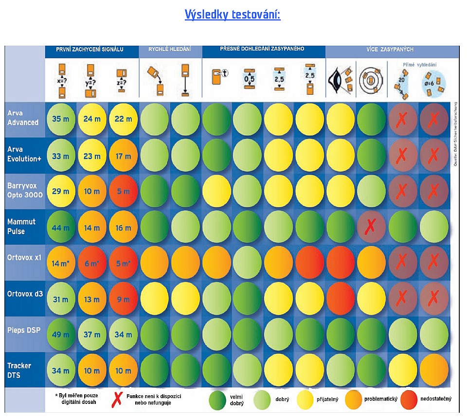 • Nové tří-anténní zařízení je především jednoduše přepínatelné z módu vysílání do módu vyhledávání. Nicméně nás celkově nepřesvědčilo ani při vyhledávání jednoho zasypaného, ani v případě většího počtu zasypaných. Navíc dosah třetí antény je omezen na vzdálenost menší než dva metry, čímž ztrácí výhodu tří-anténní technologie při lokalizaci hluboko zasypaných osob