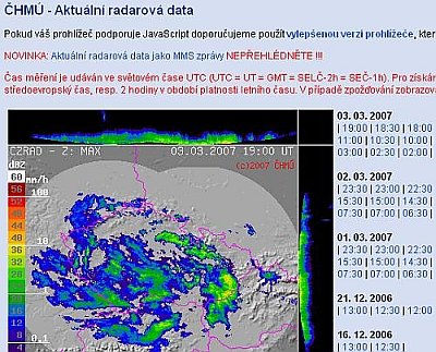 Snímky z radaru jsou mnohem přesnější. Ukazují ne předpověď (odhad), ale konkrétní a skutečnou situaci, co se srážek týče. Modrá značí mírnější srážky, zelená silnější a žlutá s červenou silný přívalový déšť.