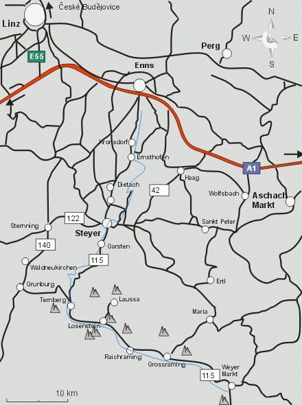 Nejlepší přístup je přes České Budějovice a dále na Freistadt  pak je dobré opustit a po silnici 123 se vydat přímo k Dunaji do Mathausenu, kde přejedete řeku a dále již směřujete k Ennsdorfu a směrem na větší město Steyr. Odtud je to již jen coby kamenem dohodil.