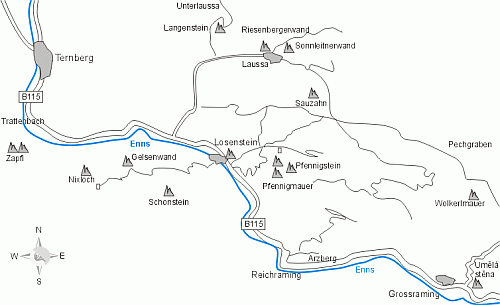 Nejlépe je dojet do Losensteinu, odtud je to jen kousek do Laussy, kde je asi nejlepší lezení. Z Laussy se totiž můžete vydat na pěkné skály hned u ní nebo vyjet na jednu stranu a navštívit nevelkou ale pěknou stěnu Langenstein,  či druhou na Sauzahn. Z Losensteinu naopak , pokud bude teplo, je dobré přejet řeku a vystoupat k usedlosti a vyrazit k oblasti zvané Nixloch
