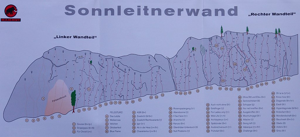 Sonnerleitnerwand - Pás stěn s řadou velmi pěkných cest. Dobré chyty, mírně převislá stěna asi kolem 40 cest do 8plus. Sever. Dobré na léto.