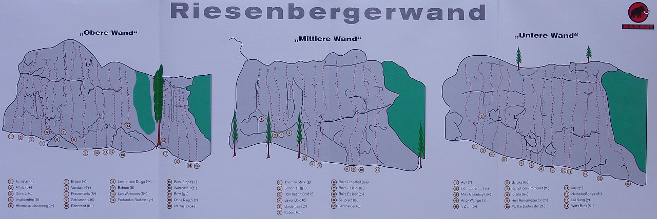 Riesenbergerwand - Pás stěn, který je jakoby pokračováním hřebenu výše zmíněné stěny s další dávkou pěkných cest v pevné skále.Sever. Dobré na léto.
