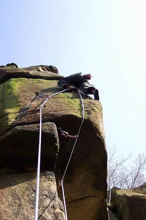 Sbalily jsme saky a pohnuly se směrem k další lahůdce - ceste Moyer's Buttress, E1 5b na skále stejného jména. Vyhlášená klasika. Prý to má být nejhezčí E1 cesta v Peak Districtu. Zatímco Alex tahal jsem se já uklidnil a vyvedl si to hned po něm. Krásná změna po předešlém rozrušení.