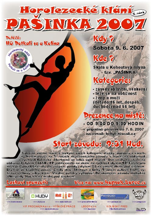 Ten proběhne v sobotu 9. 6. 2007 na Skále u Kohoutova mlýna - tzv. "Pašince". Prezence od 9:00 do 9:30 na místě. Případně předem do 7. 6. 2007 na tento email behyl@tiscali.cz Startovné se letos opět neplatí. Start závodu 9:31. Kategorie: ženy a muži (děti do 16 let, dospělí, důchodci nad 56 let). Dvě cesty na skále na obtížnost stylem řekněme FLASH, jedna cesta na skále na rychlost stylem TR. Finále pro nejlepší (počet finalistů dle uvážení poroty) stylem OS na umělé stěně pod širákem. Leze se za každého počasí. Cesty staví Střihoun a Běhy. Tradiční putovní trofej vyhrává celkový vítěz klaní. Dostatek sponzorovaného pitiva zajištěn. Po skončení závodů mohutná afterpárty na místě. Vlastní půllitry výhodou! Nocleh na místě a v blízkém okolí pod širákem, či ve vlastním stanu.