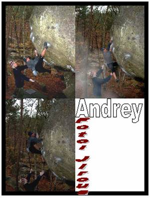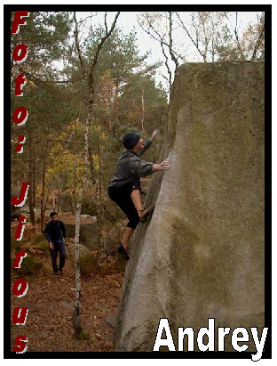 Andrej na trojfotce leze El Poussah 6c/7a. Klíčem je právě ta noha nad hlavou. Při začátku z chytu vpravo dole je to za 7b.