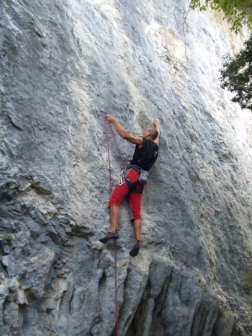 Lezení: Na Terra Promessa je 34 cest a 4 projekty (a komu počet nesouhlasí s přehledem, umí počítat, do přehledu jsou zahrnty i délky 3 vícedélkových cest). Vzhledem k obtížnosti cest je to jistě oblast na více návštěv pro výkonnostní a vrcholové lezce. Tak jsme tu. Na parkovišti jsou 2 auta, to znamená, že na skalách bude 2 až 10 lezců. Pěšina do skal nelze přehlédnout. Skály jsou mnohem větší, než jsme čekali. Co nás trochu rozladilo, byl bordel kolem ohniště a pár exkrementů pod skalmi. To snad  ani nemohli udělat lezci. Oblast je opravdu rozlehlejší, než se z průvodce zdá. Až úplně vpravo potkáváme osádku obou vozů a jsou jen 2. Nepochopitelné, dole přecpané Massone a tady 2 lezci. A konečně něco o lezení. Zdejší vápenec je místy hrubý šedivý až silně zkrápníkovaný nebo žlutý a okrový, to může být i lehce lámavý, některé chyty jsou zpevněny sikou. Potenciál stěny není zdaleka vyčerpán, asi chybí dělníci. Stěnu lze rozdělit do 3 sektorů.