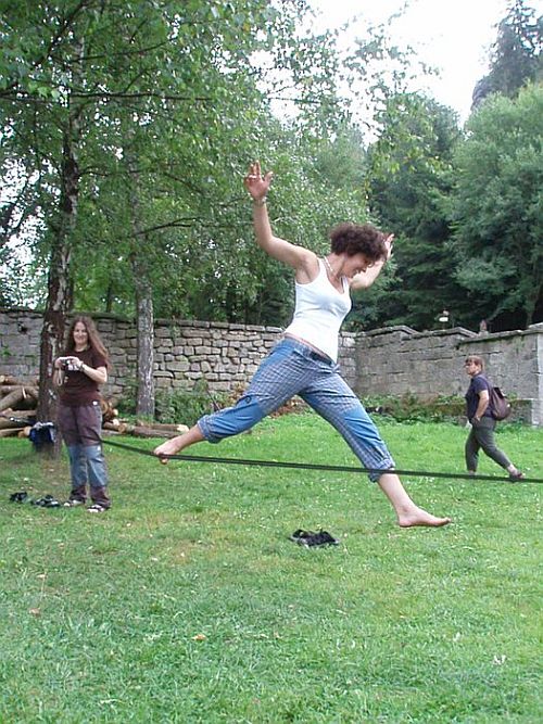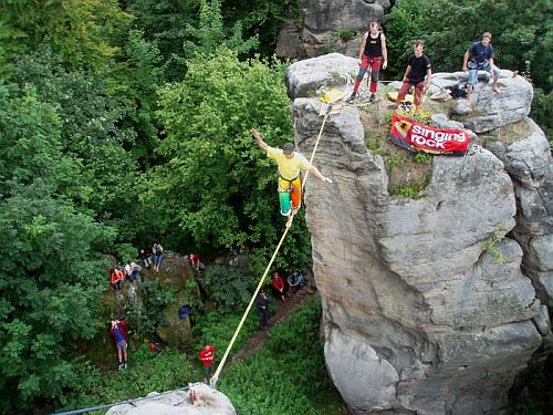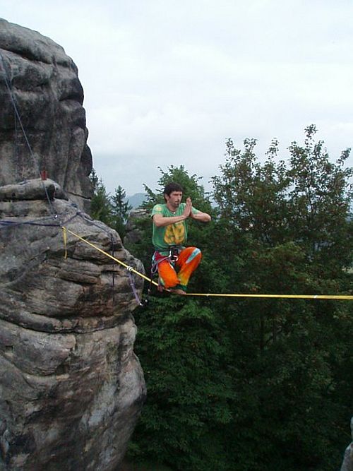 Vyvrcholením celého setkání byla nedělní highline, natažená v nedalekých skalách. Žlutej plocháč se třepetal asi v jedenácti metrech a byl tak osm metrů dlouhej. Na první pohled nepůsobil nijak hrůzostrašně, až do chvíle, než se člověk přiblížil s úmyslem přejít. Pak začal šrumec a psycho, se kterým se vyrovnával každý po svém. Někdo to vzdal a nešel, někdo překonal strach šel a "vopral" to, někdo se u toho málem posral, ale dal a dva borci dokonce předvedli ukázkový triky!