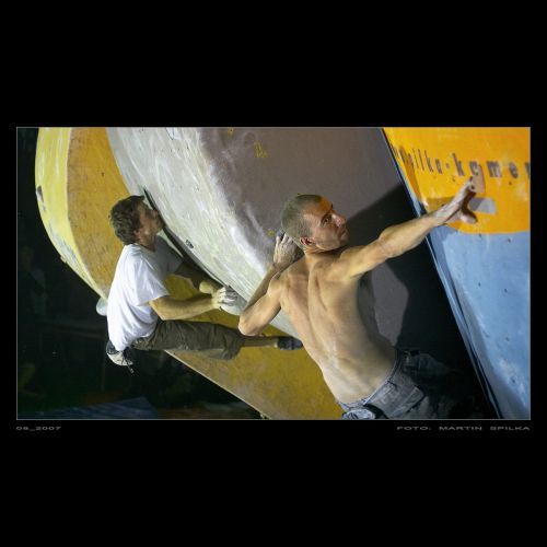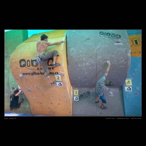 Stavění boulderů se chopil Chosé s Vildou a obě kvalifikace se jim vydařily. Na finále holkám stačili dva topy a čtyři zóny. Rozřazení proběhlo bezproblémově a první tři postupující byli Lenka Černá (za svobodna Trnková), Lenka Mičicová a Nelly Kudrová. Mužská kvalifikace byla o trochu dramatičtější, protože na finále stačil pouhý jeden top a všechny čtyři zóny. O postupu do finále pak u řady lezců rozhodoval počet pokusů na zónu a dokonce i body za chyty. Čtyři lezci postupovali do finále ze stejného místa a díky tomu se do finále probilo místo dvanácti třináct lezců. Myslím, že každý z nich si pořádně odfoukl :).  Naopak těsný nepostup Štěpána Stráníka o jeden jediný bod pěkně naštve. Já mu ale říkal ve tři ráno, že už má mít dááávno večerku :).