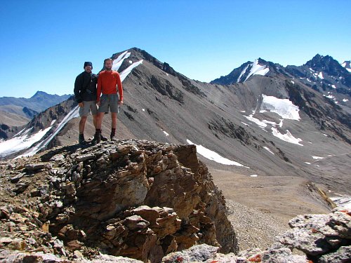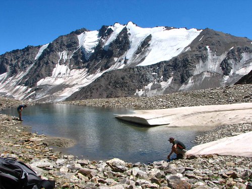 Sestup na plató se nepovedl úplně podle mých představ, z ničeho nic jsem byl po ramena v trhlině. Naštěstí nebyla hluboká a po chvíli jsme si to již kráčeli po platu k nástupu do sedla Chatkara (3550m, na mapě špatně označeno). Zde byl v poledních hodinách dokonalý mix a snad poprvé jsem musel zakopávat mačkami do suti. Naštěstí se po překročení sedla objevilo jezírko (Tatrančané by řekli pleso), ve kterém jsme zablácené mačky umyli.