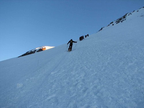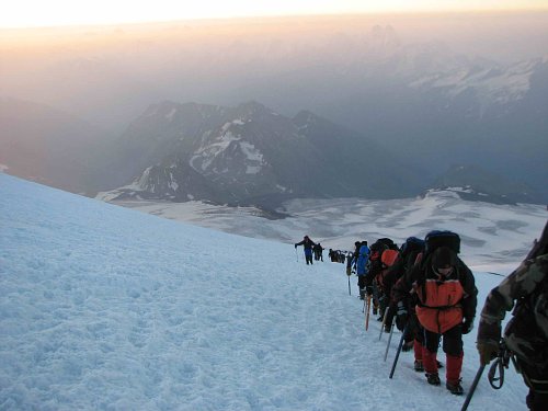 Přestože jsem se cítil v pohodě, celou noc jsem nezabral. Bob prý to samé. Dokonce tvrdil, že se dvakrát dusil. To ale přiznal až odpoledne. Pořádná aklimatizace chyběla.  Ve 3 hodiny jsme přesto vyrazili a nebyli jsme zdaleka první. Kolem se proháněli mastňáci na rolbách, které je vyvážely k začátku Pastuchových skal (údajně za 500R/os). Led byl krásně zmrzlý, bylo relativně teplo-jen občas foukl větřík a šlo se výborně. Brzy jsme začali po vyšlapané trase předhánět ty pomalejší. Nad Pastuchovými skalami začalo foukat trochu chladněji a proto jsem oblékl bundu. Stále se šlo perfektně. Po chvíli Bob hlásí : "4900 metrů, jsme nad Mont Blankem". Paráda, výškový rekord máme (doposud Dufourspitze 4634m) a stoupáme dál, již se nacházíme na dlouhém traverzu okolo východního vrcholu. Pomalu svítá, dávám pauzu a fotím.