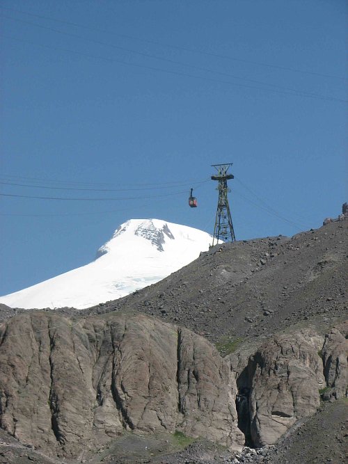 Přestože nebo právě proto, že bylo doposud nádherné počasí a čekali jsme změnu k horšímu, spěchali jsme nahoru za našim hlavním cílem - Elbrusem. Nechali jsme část bagáže v rozestavěném hotelu Seheredzada a vydali se vstříc lanovce. V budově jsme neviděli žádnou kasu (místo ní byla Apteka/lékárna) a podlehli jsme, bohužel, pracovníkovi lanovky, který nás pobídnul a sdělil taxu pro jednosměrnou jízdu nahoru: 160R+50R za batoh/osobu. Ještě nám oznámil, že každý úsek (3 úseky) se platí zvlášť. Nakonec nám dal slevu a měli jsme to za 200R/os. pochopitelně bez dokladu. Ten jsme dostali až při zaplacení jednosměrky na stanici Staryj Krugozor za 104R/os. i s batohem, který se účtuje jako 30% jízdného. Třetí úsek jsme s Bobem raději nejeli. Bylo poměrně dost času a proto jsme se sami pěšky vydali vstříc vyhořelému hotelu Prijut 11. Po cestě jsme míjeli horní stanici sedačkové lanovky Garabaši, kde jsem začal pochybovat, že jsme v národním parku. Šrot všeho druhu, od starých rozvodných skříní přes poházené el. vedení až k torzům budov. Mezi tím projíždí rolby, stanují místní horalé a patřičně ukládají své odpadky. Vrcholem byl zřícený bagr, ponechaný napospas. Rychle jsme přeběhli toto nehostinné místo a spěchali vzhůru k ledovci.