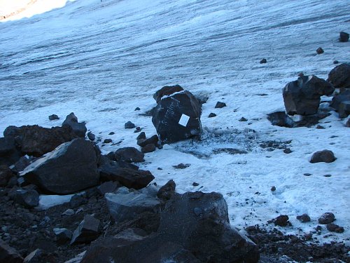 Led byl poměrně rozbředlý a občas jsme se bořili až nad kotníky. Přesto jsme dosáhli asi v 17 hodin úrovně Prijutu 11 ve výšce 4000m, kde se již tísnilo docela velké množství stanů. Po zkušenostech ze sídliště o něco níže jsme zamířili na skalnatý hřebínek východně od Prijutu11 a našli výborné místo v závětří za obrovským kamenem s pamětní deskou. Z vrcholu se valily davy horalů a vrchol samotný se halil do mraků. Snad to zítra vyjde - z počasí jsme měli respekt.