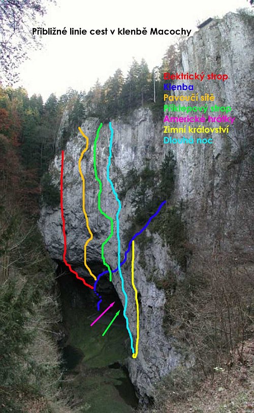 Nejlehčí cesta v klenbě. Nástup první dvě délky shodný s Klenbou. Cesta pak pokračuje přímo středem převisu po nýtech až na hranu klenby. Nad hranou se nacházejí dvě poměrně zajímavé délky lezení. Cesta je náročnější na orientaci a dolez tak občas některé méně zkušené dvojky dokáže řádně potrápit.