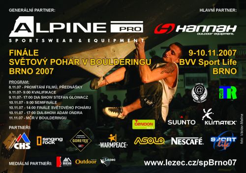Tak přesně za měsíc to tu máme. 9.-10.11.2007 proběhne na Brněnském výstavišti poslední kolo Světového poháru v boulderingu.