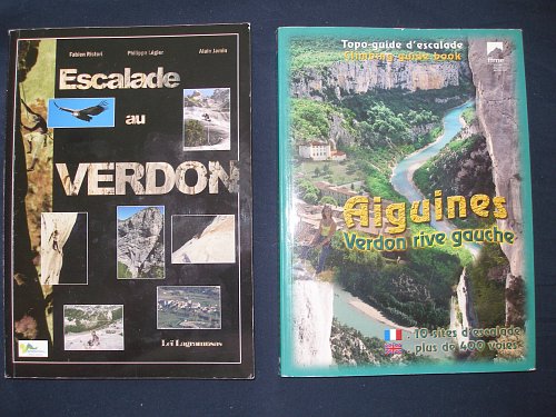 Před odjezdem jsme dosti usilovně, a přes to marně, sháněli průvodce klasických sektorů Verdonu, severní strany kaňonu dosažitelné okružní silničkou z La Palud, ve finále jsme koupili přes internet průvodce jižního okraje, 10 lezeckých oblastí rozprostírajících se za mostem u městečka Aiguines. Tento průvodce vyšel v roce 2004 a je běžně k mání na netu. Z této "jižní" oblasti bych doporučil sektory "Les Cavaliers" = krajinově fantastická hrana kaňonu která spadá kolmo dolů přímo od vyhlídkové terasy hotelu, mezi místní dominanty patří štíhlá věžička odštípnutá od hlavního masivu s velice pěknou exponovanou cestou "9,81 m/s na druhou" (dvě 35m délky 6a,6c); pro příznivce atletičtějších cest se nabízí sektor "Bauchet" s dobrým výběrem převislejších climbů v rozmezí 6c/7c no a konečně když už budete mít dost věčného slaňování k začátku cesty můžete navštívit sektor "Les Hauts Vernis", který nabízí cca 100 cest s velkým výběrem cest všech obtížností.