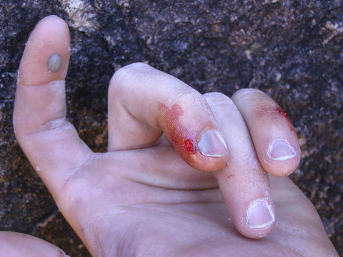 Na druhý den máme s Danem v plánu cestu Black magic woman od našich slovenských bratrů, kteří zde byli před pár lety (Alexander Buzinkay, R. Staruch a spol.), zatímco Alky s Ogym si dávají trek do okolních hor. Jistěže pro tentokrát žádné errory v plánu nejsou, ale některé věci člověk zkrátka neovlivní. Abych byl stručný, shrnul bych den následovně. První dvě délky necháváme pod sebou bez jakýchkoli komplikací. Krásné lezení v kompaktní skále a stěna se pomalu nakolmuje. Poté následuje délka třetí, s těžkým morálovým odlezem od štandu. Lezu na prvním a beru dvě ostré lišty, přičemž se připravuji na cvakání nýtu. Lišty ostré v pravém slova smyslu a tak odlehčuji bolavá bříška pomocí pravé nohy, kterou opatrně pokládám na stup po mé pravici zhruba na úrovni pasu. Pouštím levou ruku a chystám se cvaknout expresku, když v tom, co se nestane! Pravá noha se smýká ze stupu a ruka nemá šanci. Prvolezec si to tedy ukázkově míří přímo do štandu, pět metrů dolů, pádový faktor rovný dvěma. Ještě nikdy jsem nespadl do štandu a k mému překvapení je to vcelku pohodička. Nic extra, normální tlama jako každá jiná. Dano si to ale nemyslí. Při pohledu vzhůru začínám chápat. Ihned vyručkuji k němu a vidím důvod onoho poněkud hysterického řevu, který před chvilkou otřásl celým údolím. Levá ruka se mu dostala do expresky, do které jsem spadl a vypadá dost „rozmasakrovaně“. Jedna stínka přes 2/3 nehtu, druhá přes celé bříško na prstu vedle, plus nějaký odřeniny a tak vůbec. Fuck! Pro dnešek balíme a pytlíme.