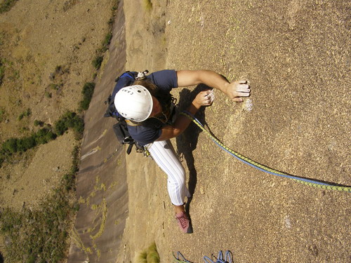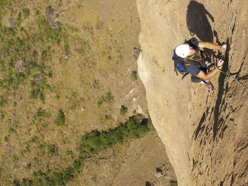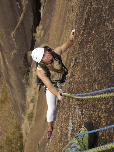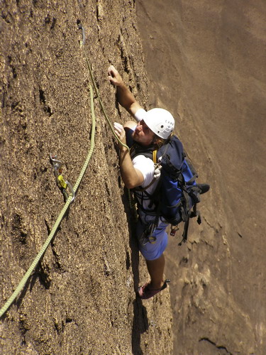 Na sobotu máme naplánovaný druhý pokus o Black magic woman (přesně po týdnu). Jak jsem si dal záležet, abych tentokrát ty dvě ostré lišty podržel a cvaknul tu presku! Povedlo se. Ulevilo se mi, ale při pohledu nad sebe jsem se opět zapotil. V průvodci psali, že cesta je „dangerous“, nyní jsem však začínal chápat proč. Zhruba 5 metrů nad prvním nýtem následuje asi 10-ti metrová psycho sekvence mezi obrovskými psycho lupeny, to vše umístěno přímo nad psycho štandem. Prokličkovat mezi nimi, dolézt délku, štand. Dano si dává následující klíčovou délku, pak já ještě jednu a jsme na vrchole. Každou délku přitom za námi jumaruje Alky s kamerou, takže se daří natočit i nějaké záběry ze stěny.