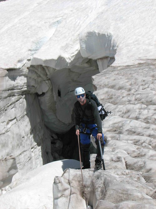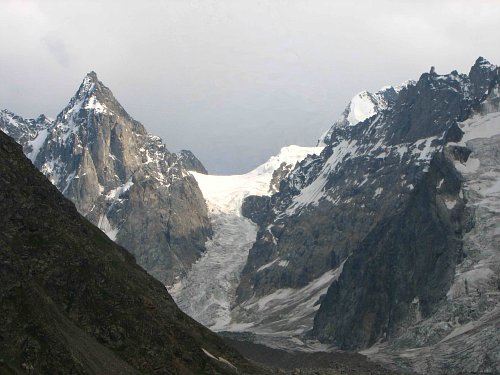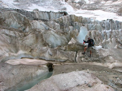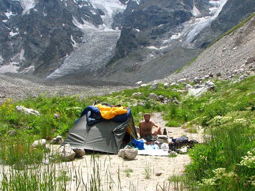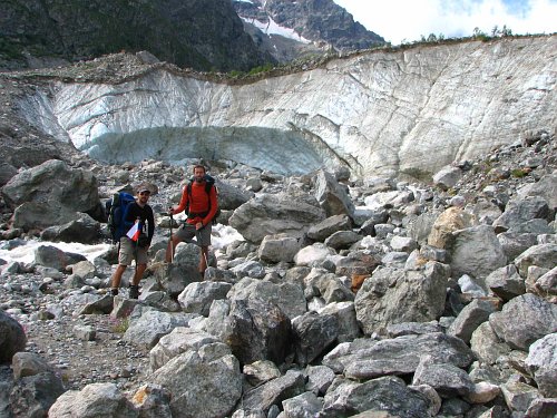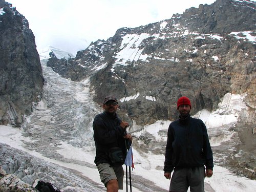 Cestou dolů jsme potkali osazenstvo dvou stanů opět Čechů, kteří se hlemýždím tempem přesunovali k bivaku. Sestup ke stanu proběhl v poklidném tempu. Asi hodinku jsme vyplnili spouštěním balvanů do trhlin a ledovcových potoků. Večer docela dlouho prší. Následující den jsme sestoupili pod čelo ledovce z něhož neustále něco padá. Tady jsme vyprali stan od písku, postavili pár přehrad (zase jsem byl malým klukem) a sešli až do údolí na poslední noc k Osmanovi, kde jsme se výtečně zkulturnili.