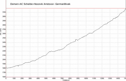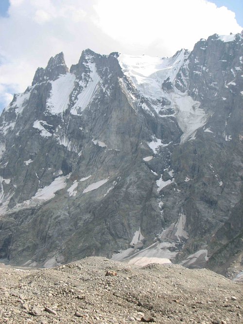 Zde se terén začal měnit a nastala doba kamenná. Mezi obrovskými balvany se stezka ztrácí a jde se, chvílemi i leze, jen podle toho, kudy to trochu jde. Nedá se řídit ani podle kamenných mužíků. Tady naše nohy a vlastně celé tělo dostávají opravdu zabrat. Čelo ledovce je již téměř na dosah, snad to nad ním bude lepší. Míjíme jej a bohužel lepší to není. Pokračujeme stále po neuvěřitelně neschůdném, neznačeném terénu tušeným směrem k Nočevkám Aristova (2550m), kde hodláme strávit dvě volné noci. Cesta je to nekonečná a ozývají se puchýře, o kterých jsem doposud nevěděl. Kolem 16.hodiny jsme na malém, písečném plácku velkém tak pro maximálně 3-4 stany. Mám toho plné zuby, prý ledovec. Kamenovec je to. Při pohledu na trasu zítřejšího pochodu, byť na lehko, mě ovládá nechuť. Voda je asi 500m od tohoto stanoviště. Náladu mi trošku spravuje výborná obědovečeře a pozorování lavinek v Scheldské stěně.