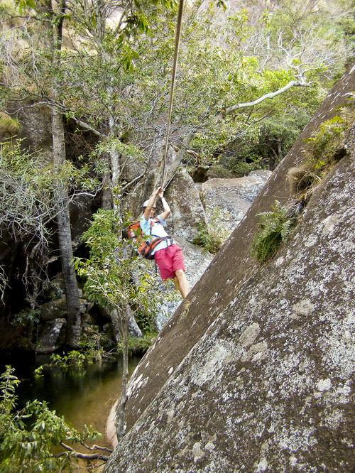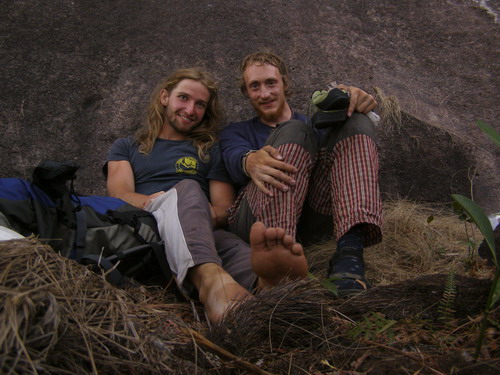 Ráno na vrcholu Tsaranora je chladné a po studené noci jsme pořádně vymrzlí, je tedy potřeba nechat se důkladně na ranním sluníčku rozmrazit. K tomu mám zimnici, střevní potíže a není mi vůbec dobře (nejspíš se jedná o nějakou virózu). Nejprve, než sejdeme dolů, však musíme kousek slanit a vylézt znova poslední dvě délky Afriky, aby mohl Alky shora pořídit nějaké záběry. Je to boj, ale daří se a tak okolo oběda můžeme sestoupit. K sestupu z Tsara asi takto: člověk si nevybere. Slanění je blbý a sestup ještě horší. Jedno větší pakárna než druhý. Slanění je psycho kvůli všem těm mikrohrůtkům a šupinám, sestup zas vede pralesem a cesta chybí. Z vrcholu je to do kempu asi tak 4-5 hodin.