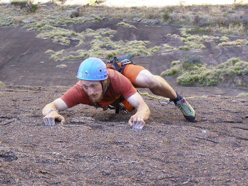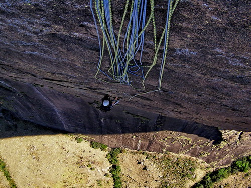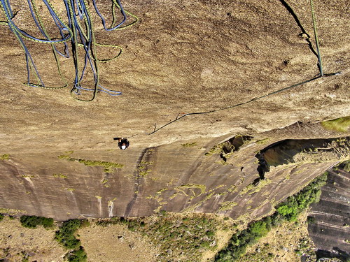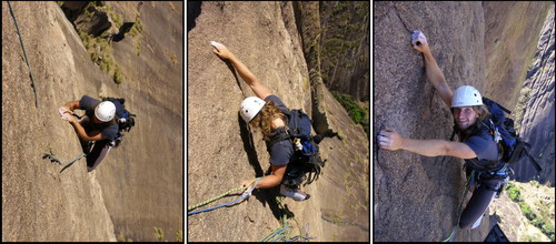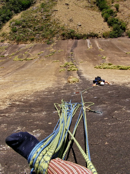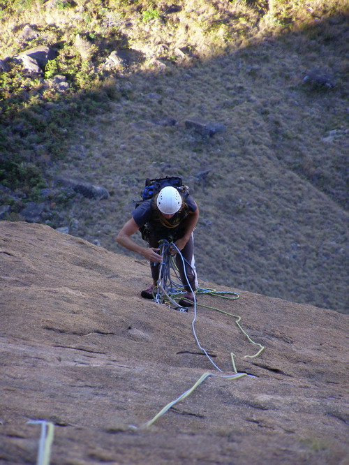 Budíček nařizujeme na čtvrtou a brzy po rozetmění jsme pod stěnou. Dano dosnídává a už to jede. Stěna opět zpočátku položená a čím výše, tím kolmější. První délka 5+, druhá 6a, dále 6b, 7a+, 7b+, 6c+, 7a+, 6c a na závěr 90 m dolez za 6b, dohromady 500 m, přičemž jen 10 délek.
