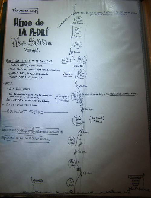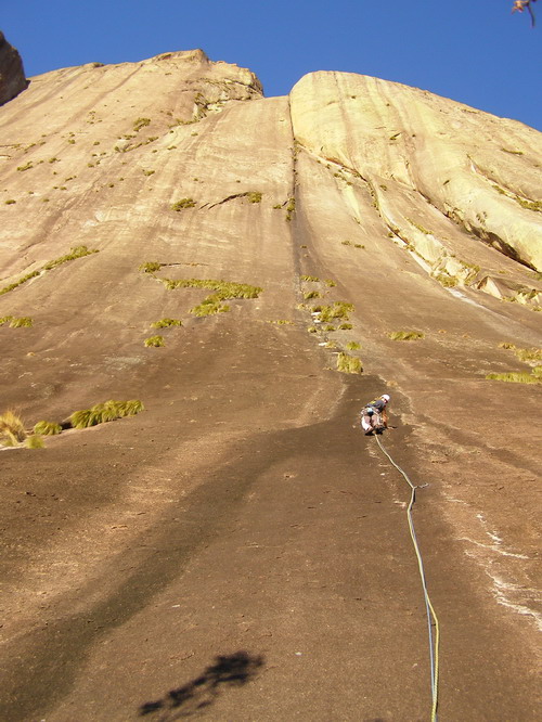 Opět prožíváme to samé jako v předchozích cestách - krásné lezení po ostré žule s morálovými odlezy, expozice je však mnohem větší než kdykoli před tím. Štandy jsou pokaždé ve visu a délky nesnesitelně dlouhé, mnohdy i 60 m. Něco parádního pro naše zdevastované nohy a ještě horší bříška. Krásně si to s Danem celý den vychutnáváme, jedná se o dovršení našeho snažení, a tak si dáváme záležet. Jestli něco z tohoto výletu zůstane navždy vryto v mých vzpomínkách, budou to právě tyto chvíle strávené společně s Danem v cestě Hijos v katedrále Tsaranora. Cesta je nekonečná a jedna psycho délka střídá druhou. Vzájemně se motivujeme a pomáháme si, pravidelně se střídáme. Klíčovou částí cesty se pro nás stává druhé 7a+ v sedmé délce. 55 metrů lezení v kolmém po mikromalých a super ostrých lištách, nic nedrží a kdykoli se může cokoli vylomit. Dano si to užívá a předvádí perfektní výkon. Je to dobrý psycho! Všechno duní a nic není jistý. Cesta potřebuje pár dalších přelezů, aby se trochu pročistily závěrečné partie, poté bude dokonalá.