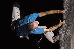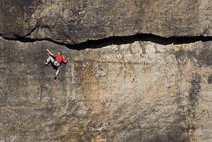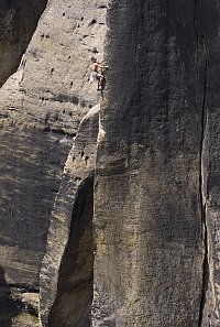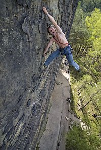 Prcas v proslulé Eiszeit v téměř padesáti letech na přímém slunci dává naději i nám ostatním, že ještě s lezením nemusíme končit. Záběr ukazuje, že Sasko umí být jen samá skála, nebe ani zeleň nevidět.