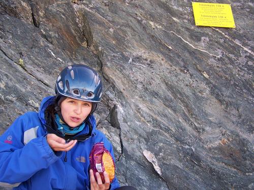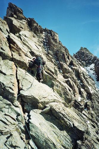Ve spodních pasážích je Stüdlgrat tvořen hlavně sutí, občas na ní bylo docela dost sněhu a ledu, ačkoliv na Glocknerské poměry bylo zřejmě úplné sucho. První trochu "lezečtější" úsek je taková úzká průrva mezi kameny, ale obtížnost to nemělo veškerou žádnou, aspoň pro lidi s normální šířkou boků. Po chvíli jsme dolezli k prvnímu borháku, do kterého jsme se sice cvakli, ale smysl měl nejspíš jen pro slanění. Po dlouhém škrábání se jsme před sebou z dálky uviděli žlutou destičku, o které jsme z fotek věděli, že představuje Frühstückplatz, odkud se má člověk, pokud mu to trvalo z chaty déle než tři hodiny, v zájmu vlastního života zase pěkně vrátit. Nám to trvalo tedy asi tři a půl, ale neměli jsme pocit, že bychom byli až tak špatní a rozhodli jsme se pokračovat. Počasí bylo nadále pěkné, ačkoliv od západu se hnala nepřehlédnutelná mračna. Hned za Frühstückplatzem byl první "lezecký" úsek, ovšem nejen že perfektně odjištěný, ale také doplněný konopným lanem. Konstatujíc, že jsme nepřijeli soutěžit v čistotě lezení, ale zdolávat vrchol, jsme ho radostně využili.