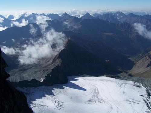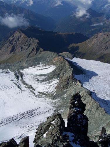 Samotné sedlo Glocknerscharte se ukázalo být jednoduché a navazující výstup na Kleinglockner byl bez problémů díky nataženému ocelovému lanu. Dále se postupuje po vrcholu a dolů, cesta je jištěna tyčemi. Nepřipadal jsem si na ní ale jistě, protože padal nový sníh a občas to klouzalo. Lopotně jsme sestupovali, Maďaři jdoucí za námi nás povzbuzovali. Pak nastal úsek, kdy je třeba sestoupit na svah, vedoucí k Adlersruhe - Martinu jsem ten kousek slanil, ale nebylo to obtížné. Všichni jsme začali nazouvat mačky. Maďary jsme pustili před sebe, ale byli velmi kolegiální a o chvíli později na nás počkali, aby nám pomohli s cestou, která ve vánici opravdu nebyla moc vidět. Sestup docela ušel, za chvíli jsme byli u Adlersruhe, kam si chlapci skočili na čaj, zatímco my jsme pokračovali po ferratě směrem k ledovci. Ferrata byla tak jednoduchá, že jsem ani nevyndaval set z batohu a řítili jsme se po ní jen v rukavicích. Když jsme dojeli na konec lana, měli jsme trochu problém s orientací, nazuli jsme mačky v domnění, že dál půjdem po ledovci Ködnitzkees, ale byli jsme ještě moc vysoko. Naštěstí se zrovna trochu vyčasilo, bylo vidět dál a spatřili jsme další ferratový úsek vedoucí k nástupu na ledovec. V mačkách jsme ho zvládli, dali si čokoládu, a vydali se přez ledovec. Na jeho spodním okraji jsme se opět špatně zorientovali a v dešti a mlze dlouze hledali mezi hučícími potoky cestu. Nakonec jsme se na ní dostali a dost utahaní došli do chaty, kde jsme si prodloužili pobyt. Bylo 18:30, tedy celkem nám ta legrace zabrala třináct hodin.