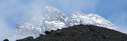 Ráno byla docela zima, zataženo a kopce byly lehce pocukřené sněhovým popraškem. Přešli jsme sedlo nad Salmhütte a potkali několik skupin lidí. Mraky se začaly trhat a najednou se vynořil Kopec - byl obrovský! Náhodou se mi při největším přiblížení podařilo udělat fotografii, kde jsou vidět drobounké postavičky na vrcholu, podívejte se.