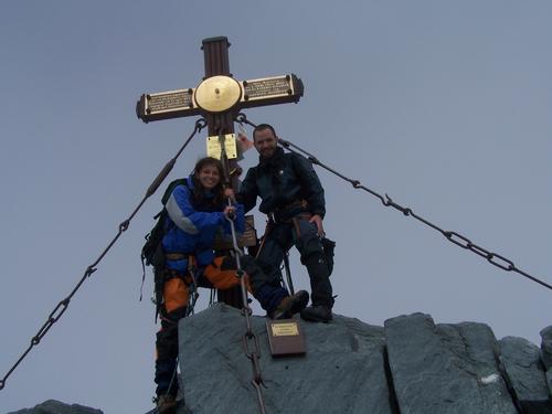 Posledních dvacet metrů je už bez problémů, tak Martina vzala lano do náruče a ke kříži jsme doklopýtali společně. Ten pocit se nedá popsat, ale obsahuje euforii, úlevu a myšlenku na krásný zbytek života v řekněme takovém polabí. Byla tam zrovna velká skupina lidí, kteří dorazili po normální cestě, ale brzo odešli a zbyli tam dva Maďaři, kteří nás vyfotili a ještě instruovali o návratové cestě. Výhledy byly ztracené a chvíle čekání na tom nic nezměnila, jenom začalo dost sněžit. Zatelefonovali jsme domů a kamarádovi, který nás z Prahy podporoval, a vydali se normální cestou zpět. Hned sestup na Glocknerscharte mě překvapil svou obtížností a Martinu jsem radši dobře jistil. Asi už se na mě dost projevila únava, protože se mi to všechno zdálo dost těžké, na to, jaký despekt jsem všude k "normálkařům" zaznamenával.