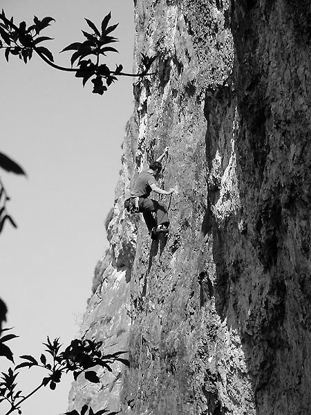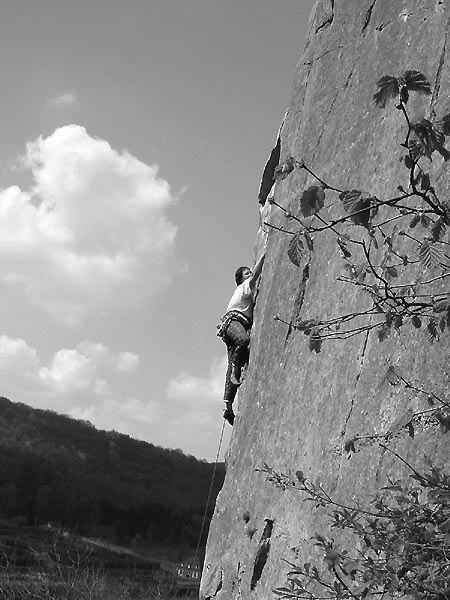 Taky trénujeme. Prý se dají vyrobit takové dřevěné desky jakoby s chyty a na nich shybovat. Zpestření k nudnému mačkání gumových kroužků, klikování a dělání leh-sedů. A výsledek se dostavuje. Začínáme okukovat magický stupeň VII a občas zajedeme na Srbsko. Tady zíráme do nesmírně hladkých ploten a obdivujeme postavičky v pestrobarevných přiléhavých kalhotách a sníme o tom, že jednou i my polezeme tyhle neskutečné prásky. Kolikrát takřka expedičně zdoláváme ty nejlehčí místní věci (většinou sedmičky, Alkazar v té době neexistoval) a když brácha prostoupí Ocel a olovo nejlehčím směrem (samozřejmě AF), je to super zážitek.